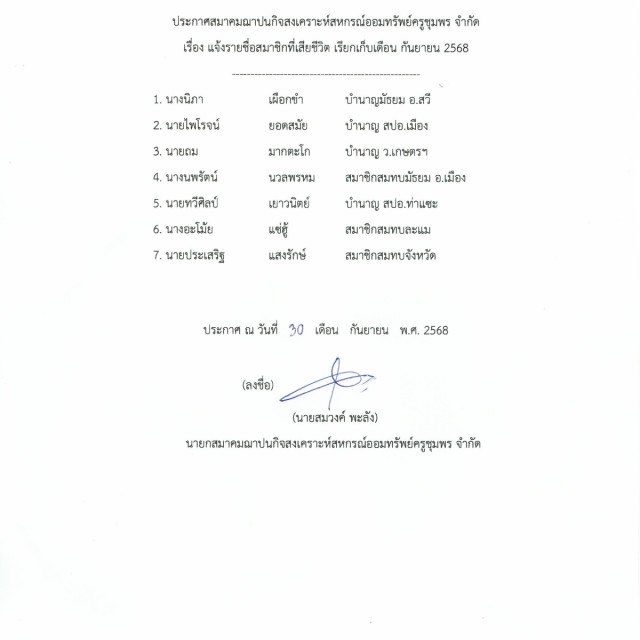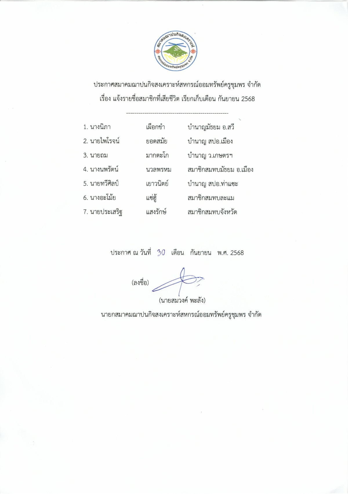 แจ้งรายชื่อสมาชิกเสียชีวิต เรียกเก็บเดือนกันยายน 2568