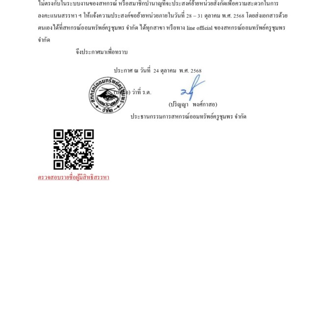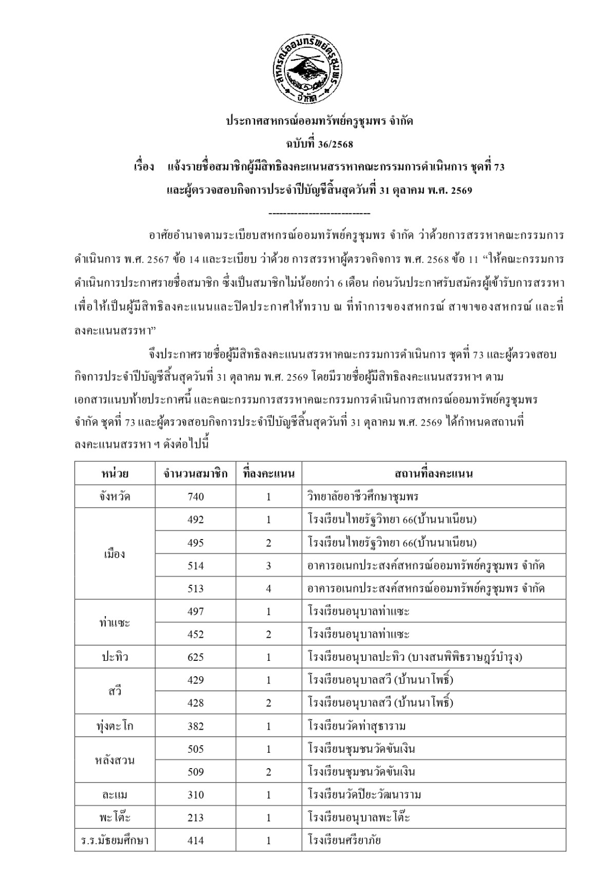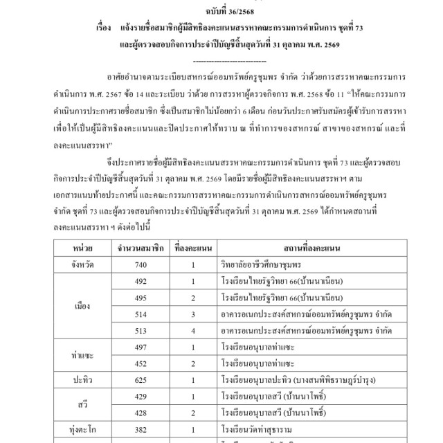 แจ้งรายชื่อสมาชิกผู้มีสิทธิลงคะแนนสรรหาคณะกรรมการดำเนินการ ชุดที่ 73 และผู้ตรวจสอบกิจการ ประจำปีบัญชี 2569