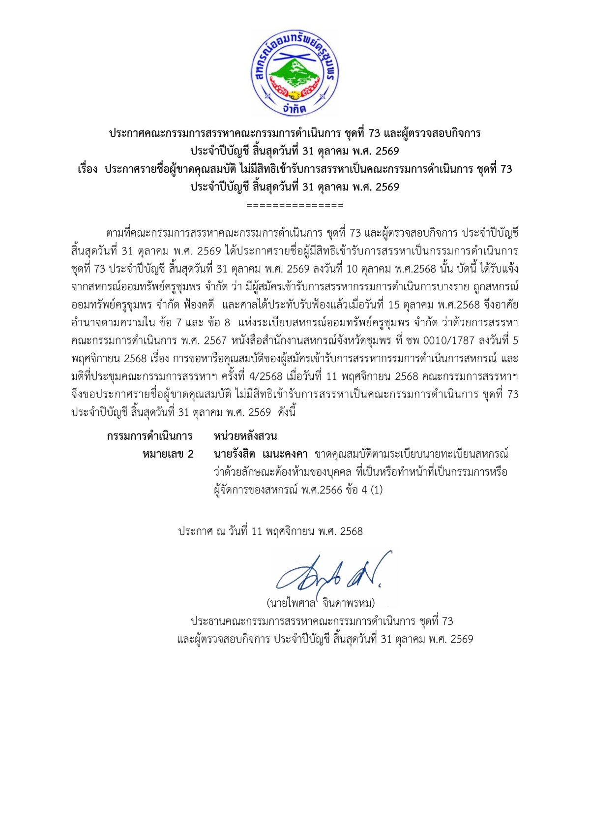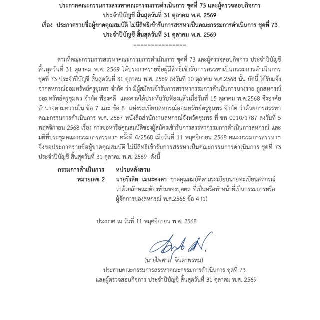 รายชื่อผู้ขาดคุณสมบัติ ไม่มีสิทธิเข้ารับการสรรหาเป็นคณะกรรมการดำเนินการ ชุดที่ 73 ประจำปีบัญชีสิ้นสุดวันที่ 31 ตุลาคม พ.ศ. 2569