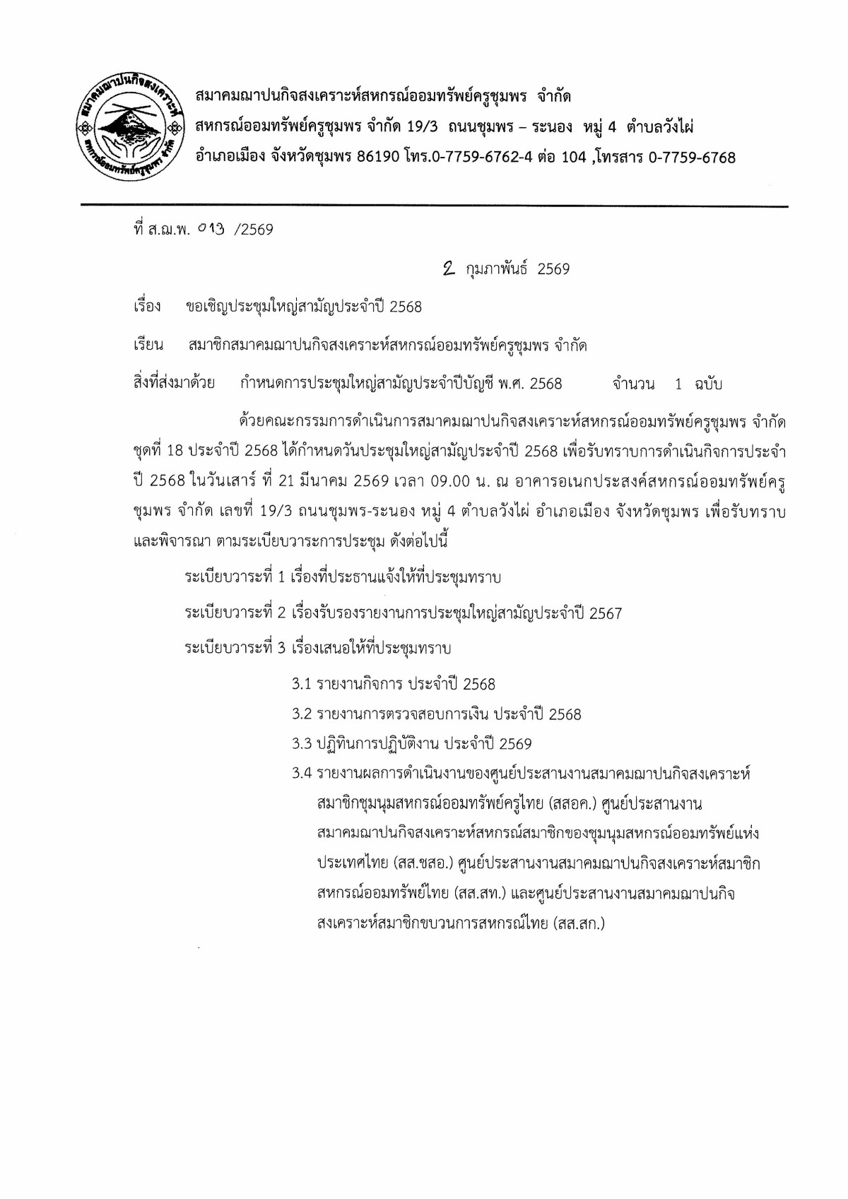 ติดต่อสหกรณ์โทร 077-596-762-3 และ 077-596-673-4