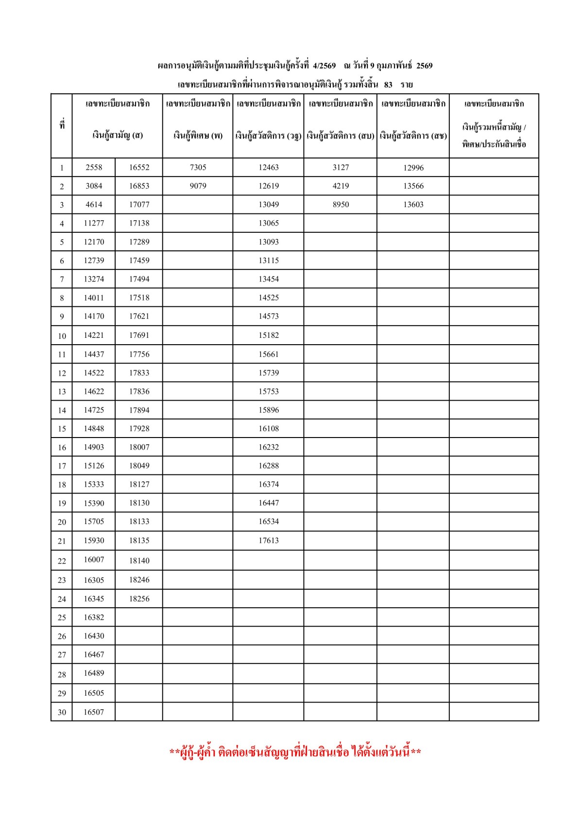 ผลการอนุมัติเงินกู้ตามมติที่ประชุมเงินกู้ครั้งที่ 4/2569 ณ วันที่ 9 กุมภาพันธ์ 2569