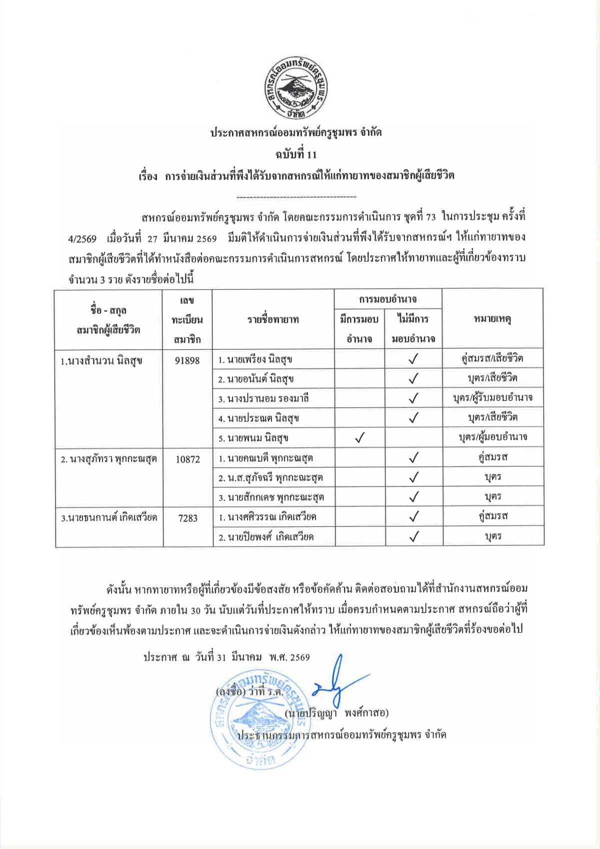 การจ่ายเงินส่วนที่พึงได้รับจากสหกรณ์ให้แก่ทายาทของสมาชิกผู้เสียชีวิต (เดือนมีนาคม 2569)
