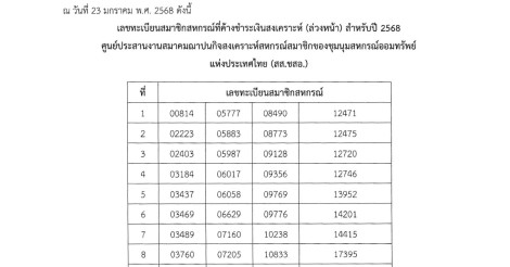 สส.ชสอ.แจ้งทะเบียนสมาชิกสหกรณ์ที่ค้างชำระเงินสงเคราะห์ (ล่วงหน้า) สำหรับปี 2568