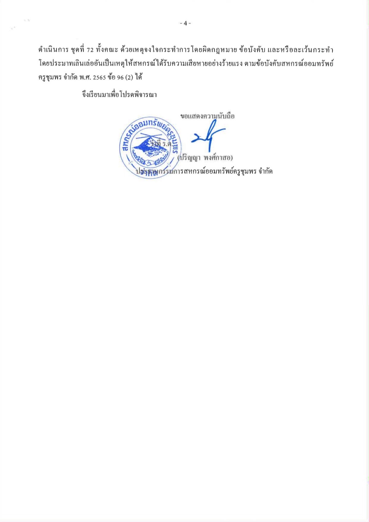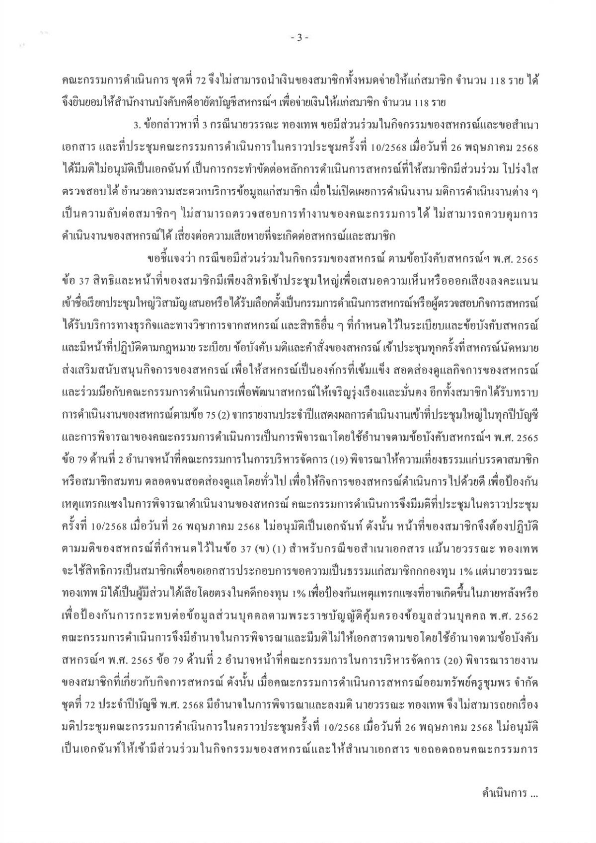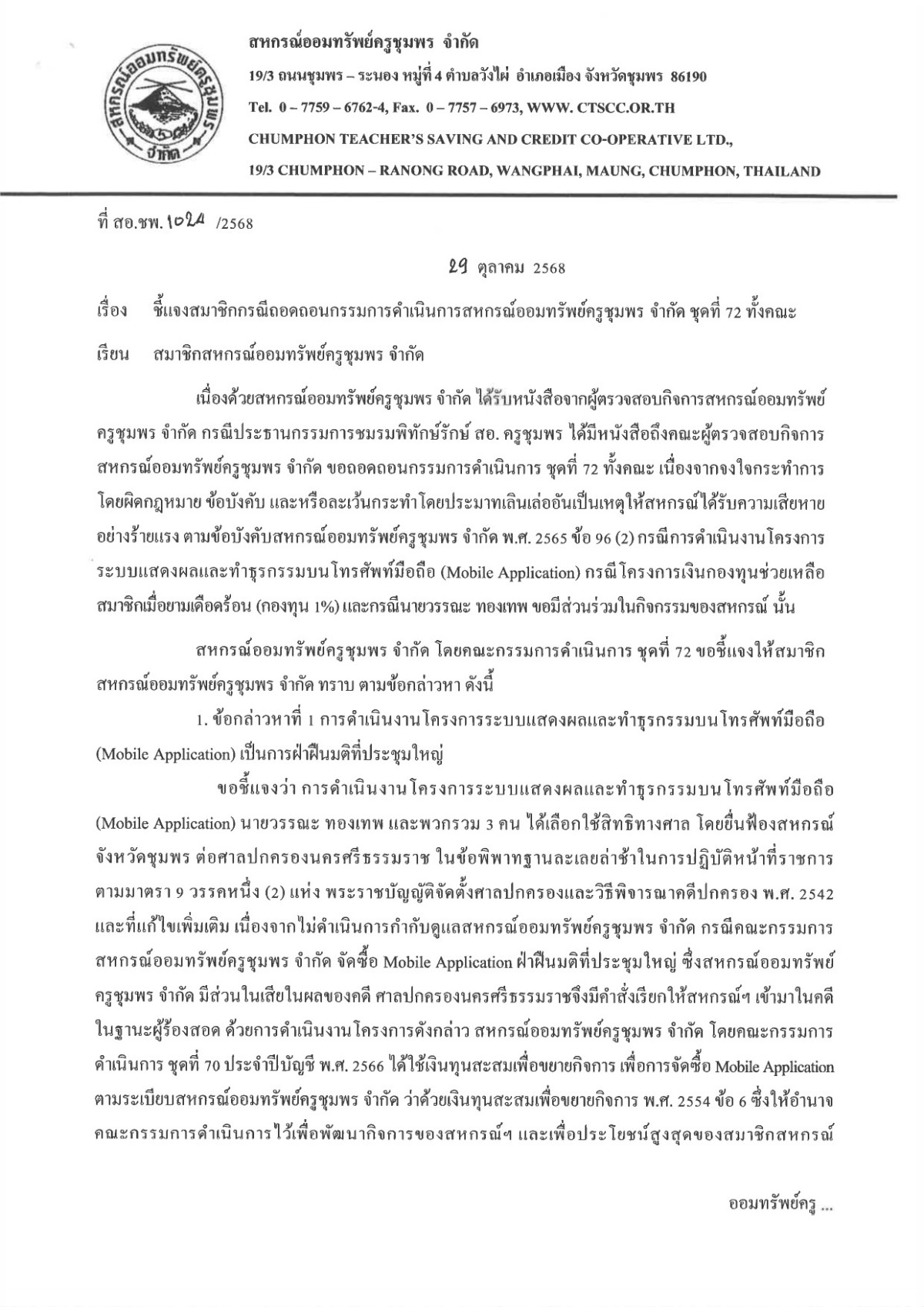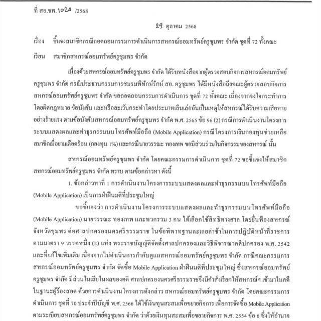 ชี้แจงสมาชิกกรณีถอดถอนกรรมการดำเนินการสหกรณ์ออมทรัพย์ครูชุมพร จำกัด ชุดที่ 72 ทั้งคณะ