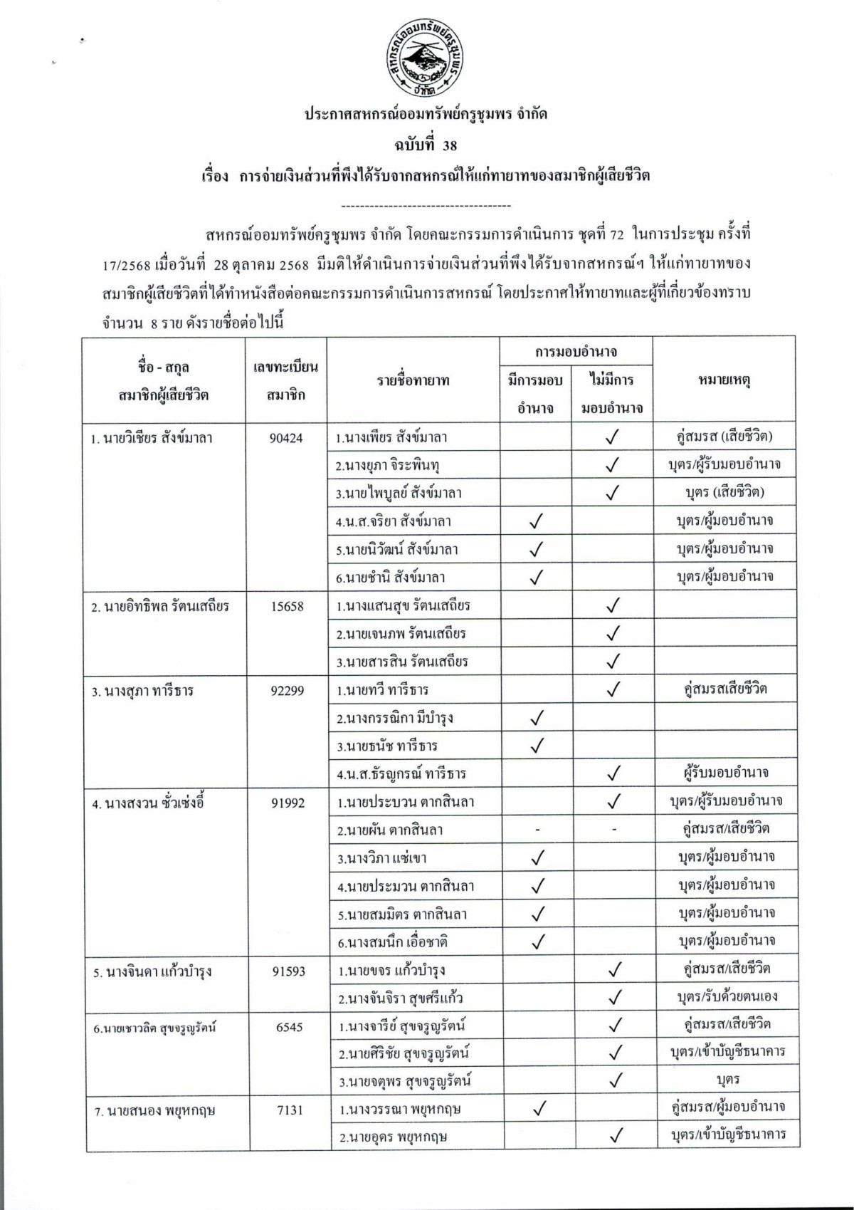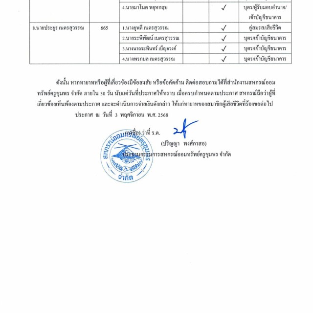 การจ่ายเงินส่วนที่พึงได้รับจากสหกรณ์ให้แก่ทายาทของสมาชิกผู้เสียชีวิต (เดือนตุลาคม 2568)