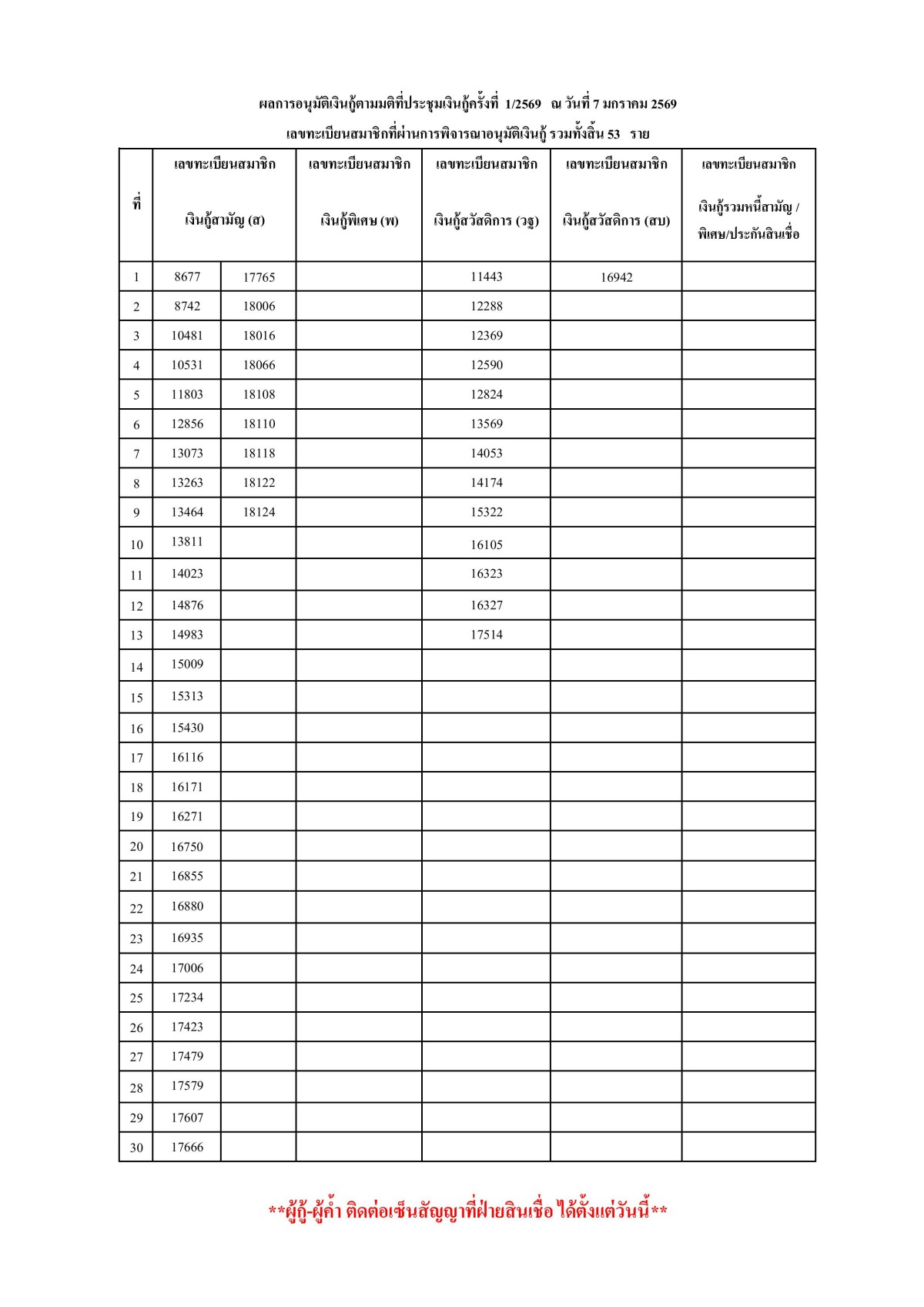 ประกาศ : ผลการอนุมัติเงินกู้ตามมติที่ประชุมเงินกู้ครั้งที่ 1/2569 ณ วันที่ 7 มกราคม 69