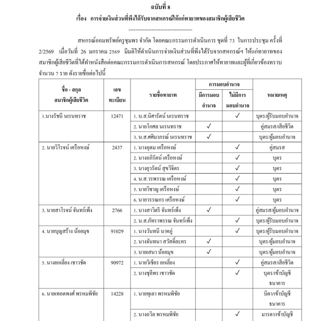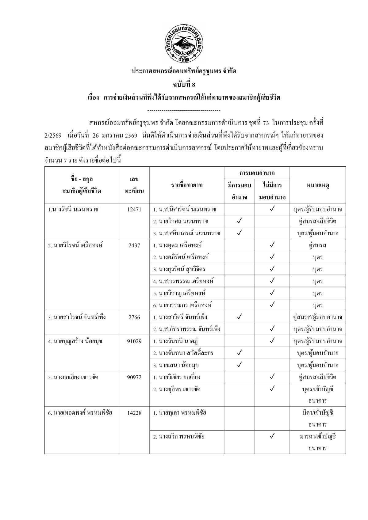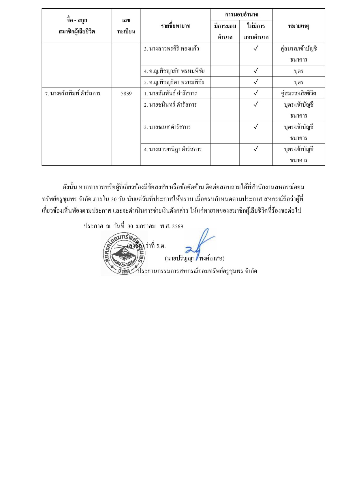 การจ่ายเงินส่วนที่พึงได้รับจากสหกรณ์ให้แก่ทายาทของสมาชิกผู้เสียชีวิต (เดือนมกราคม 2569)