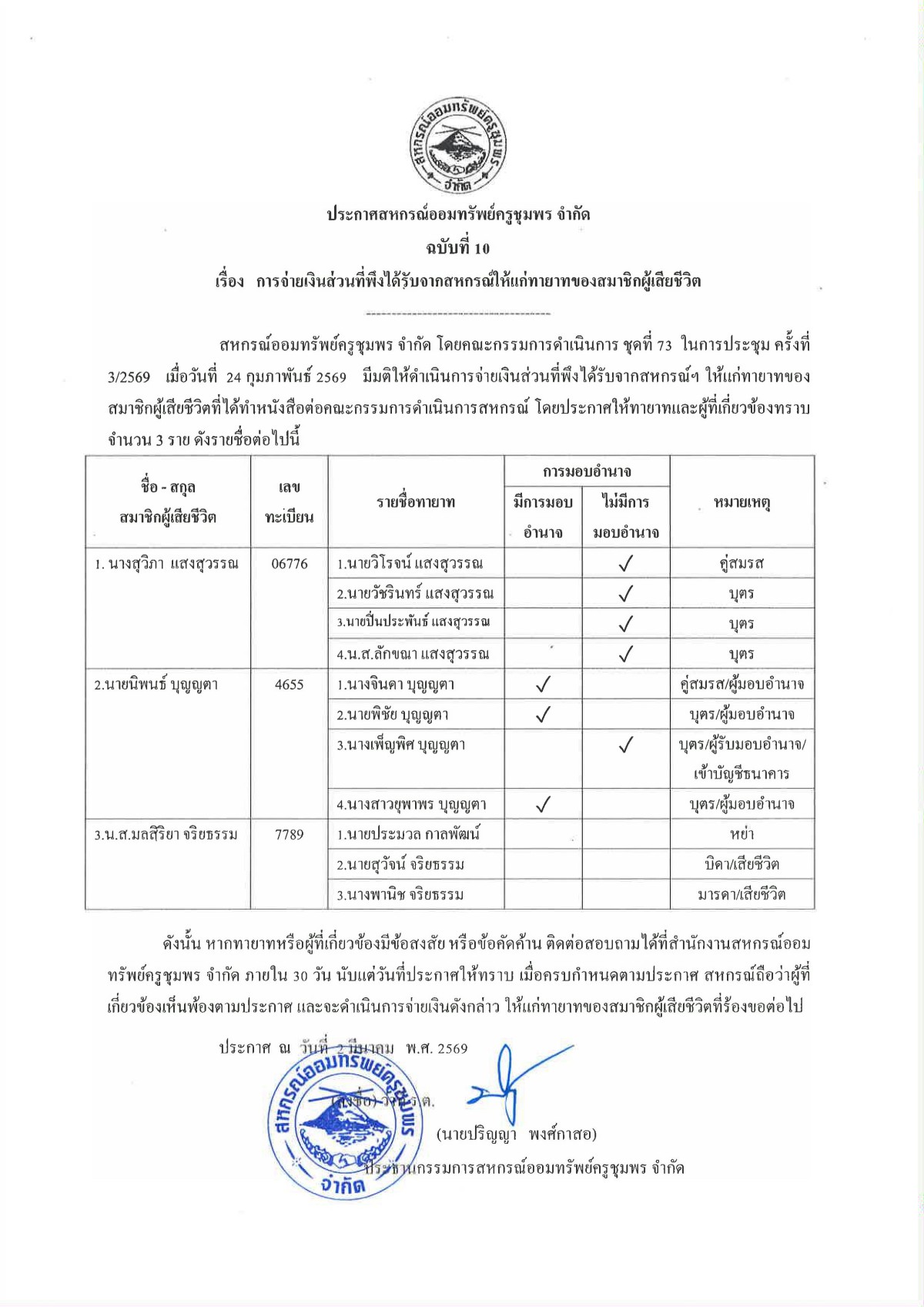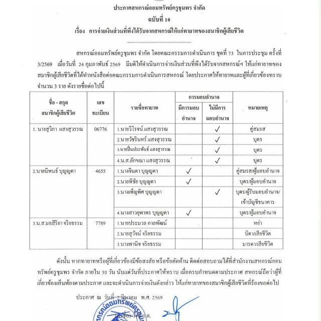 การจ่ายเงินส่วนที่พึงได้รับจากสหกรณ์ให้แก่ทายาทของสมาชิกผู้เสียชีวิต (เดือนกุมภาพันธ์ 2569)