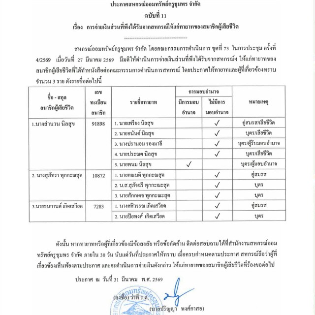 การจ่ายเงินส่วนที่พึงได้รับจากสหกรณ์ให้แก่ทายาทของสมาชิกผู้เสียชีวิต (เดือนมีนาคม 2569)